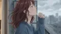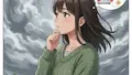 窓の外では桜の若葉が強風に大きく揺れ、竹もしなやかにたわんでいます。曇り空の下、太陽が出たり隠れたりを繰り返す柔らかな光の中の風景です。